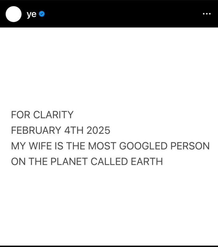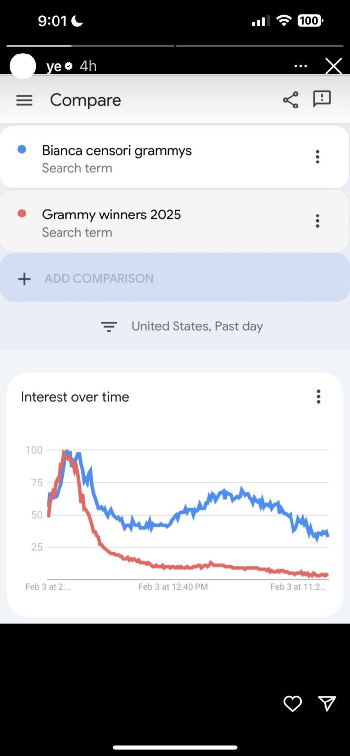 Now, Ye is reacting to Bianca dominating the headlines, as he shared Google search data for "Bianca Censori Grammys," which showed her name at the top of the list of trending Google searches after the Grammys. He wrote, "FOR CLARITY. MY WIFE IS THE MOST GOOGLED PERSON ON THE PLANET CALLED EARTH." Ye added, "WE BEAT THE GRAMMIES."