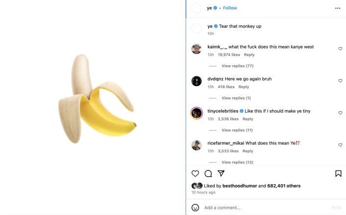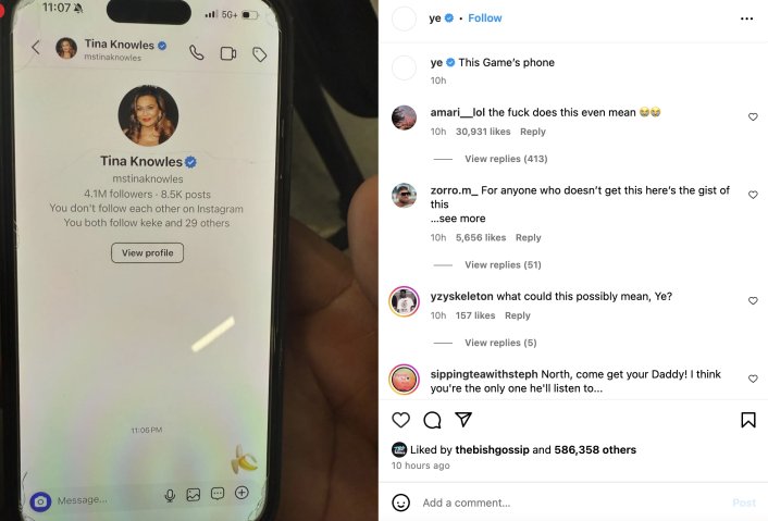 Ye kicked things off with a peeled banana emoji, captioning it, "Tear that monkey up." At first, fans were confused by the post, but it all started making sense when he later revealed a DM from The Game to Tina Knowles—featuring the same banana emoji. Ye followed up with a cryptic statement: "Game finna slide for the guys."