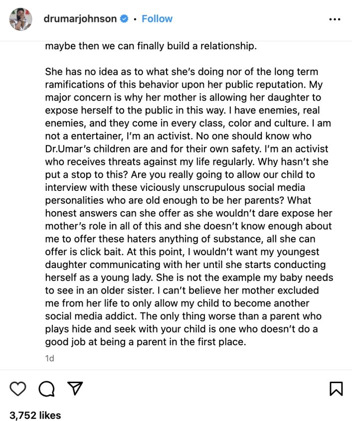 Beyond the abuse allegations, Anisa also called Dr. Umar a "deadbeat father," claiming he was absent for key moments in her life.