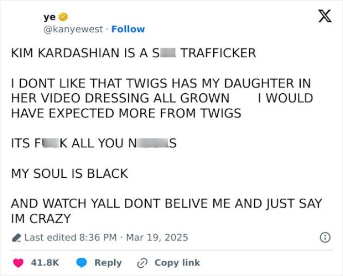 West also expressed outrage over his daughter North West's involvement in an FKA Twigs music video, stating, "KIM KARDASHIAN IS A SEX TRAFFICKER. I DONT LIKE THAT TWIGS HAS MY DAUGHTER IN HER VIDEO DRESSING ALL GROWN WOULD HAVE EXPECTED MORE FROM TWIGS (sic)."